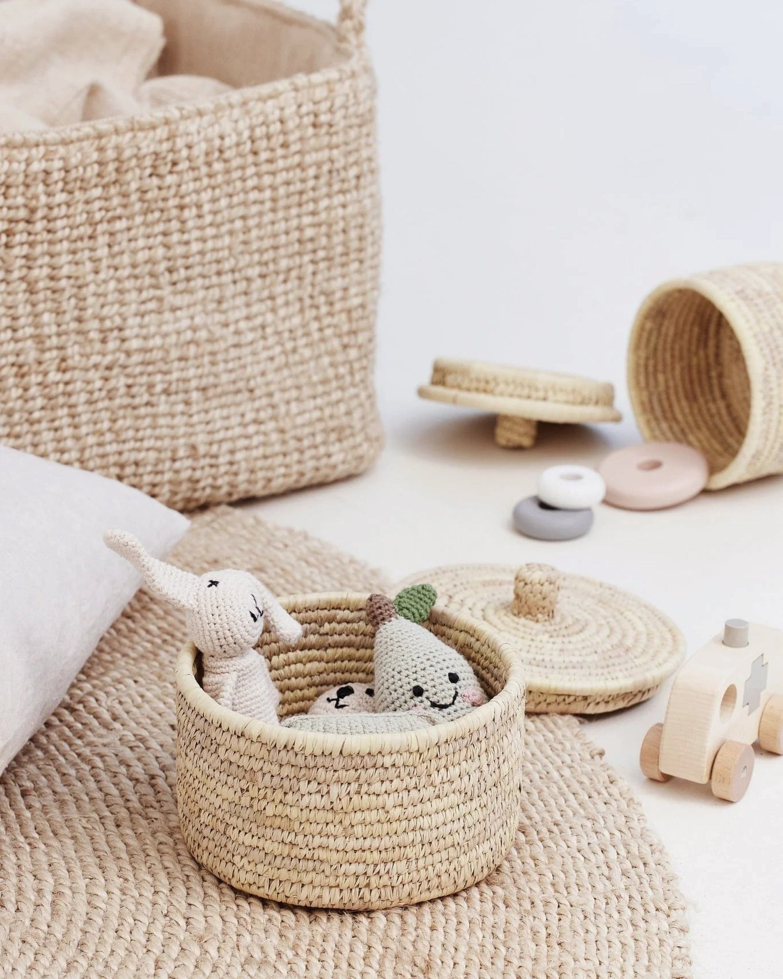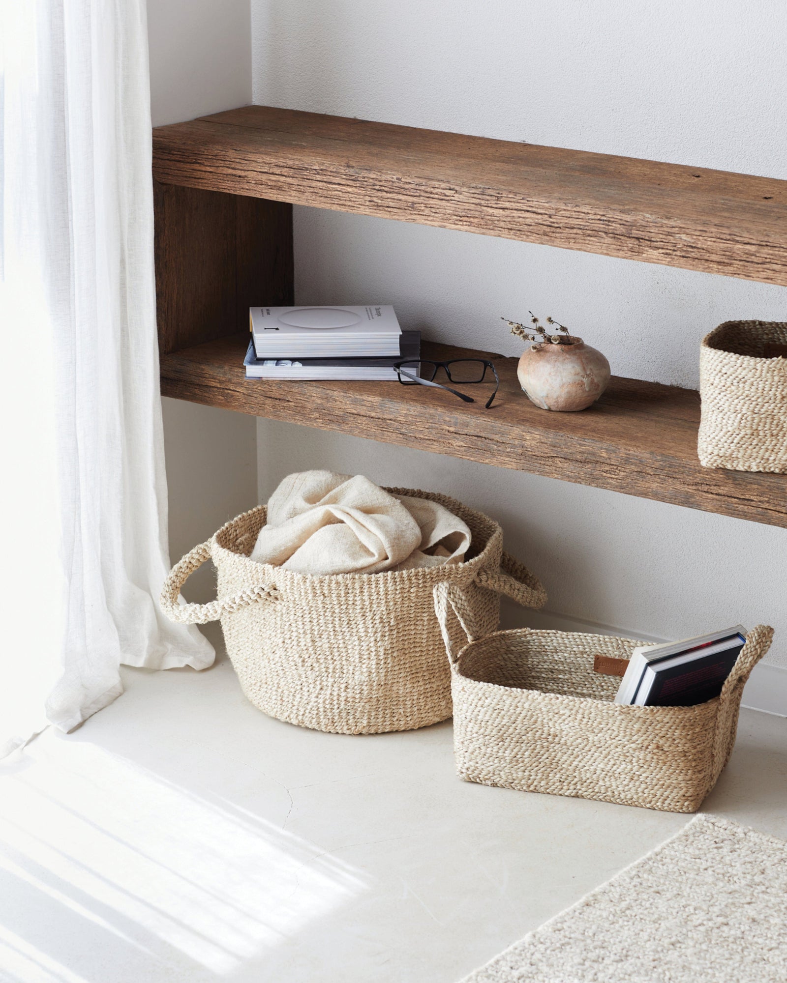 For items that need to remain on display for easy access, aesthetically pleasing storage solutions like woven baskets can make home organisation both functional and beautiful. Available in a variety of shapes and sizes, they’re versatile enough to suit any space, while their neutral tones blend effortlessly with most interior styles. Unlike plastic alternatives, handwoven baskets are sustainable, stylish, and add a layer of natural texture to your decor.